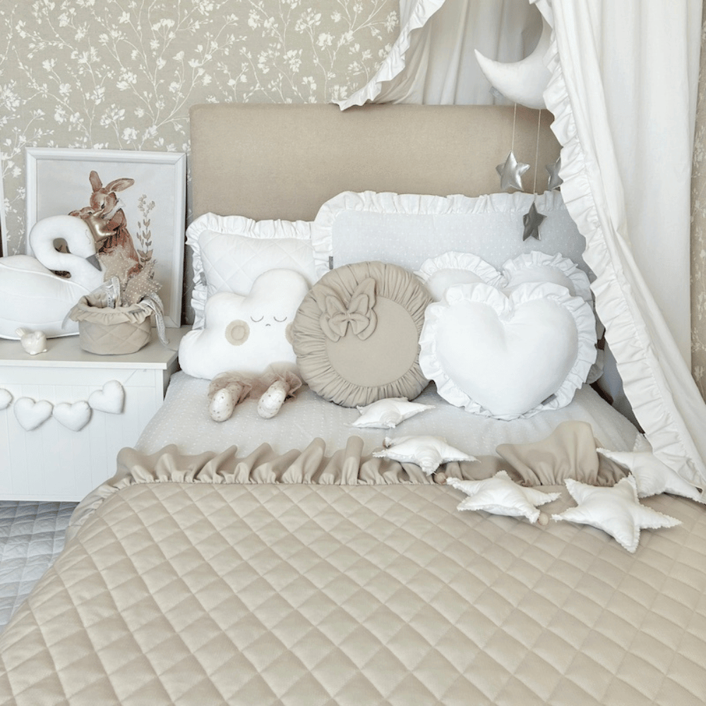 Rozmiar narzuty dotyczy samej części pikowanej. Do niego należy doliczyć dodatkowe 12 cm falbanki z każdej strony, która miękko opływa brzegi i nadaje całości niezwykle efektowny, lekki charakter. Falbanka subtelnie oprawia pikowane wnętrze, dodając mu delikatności i dziewczęcego uroku.