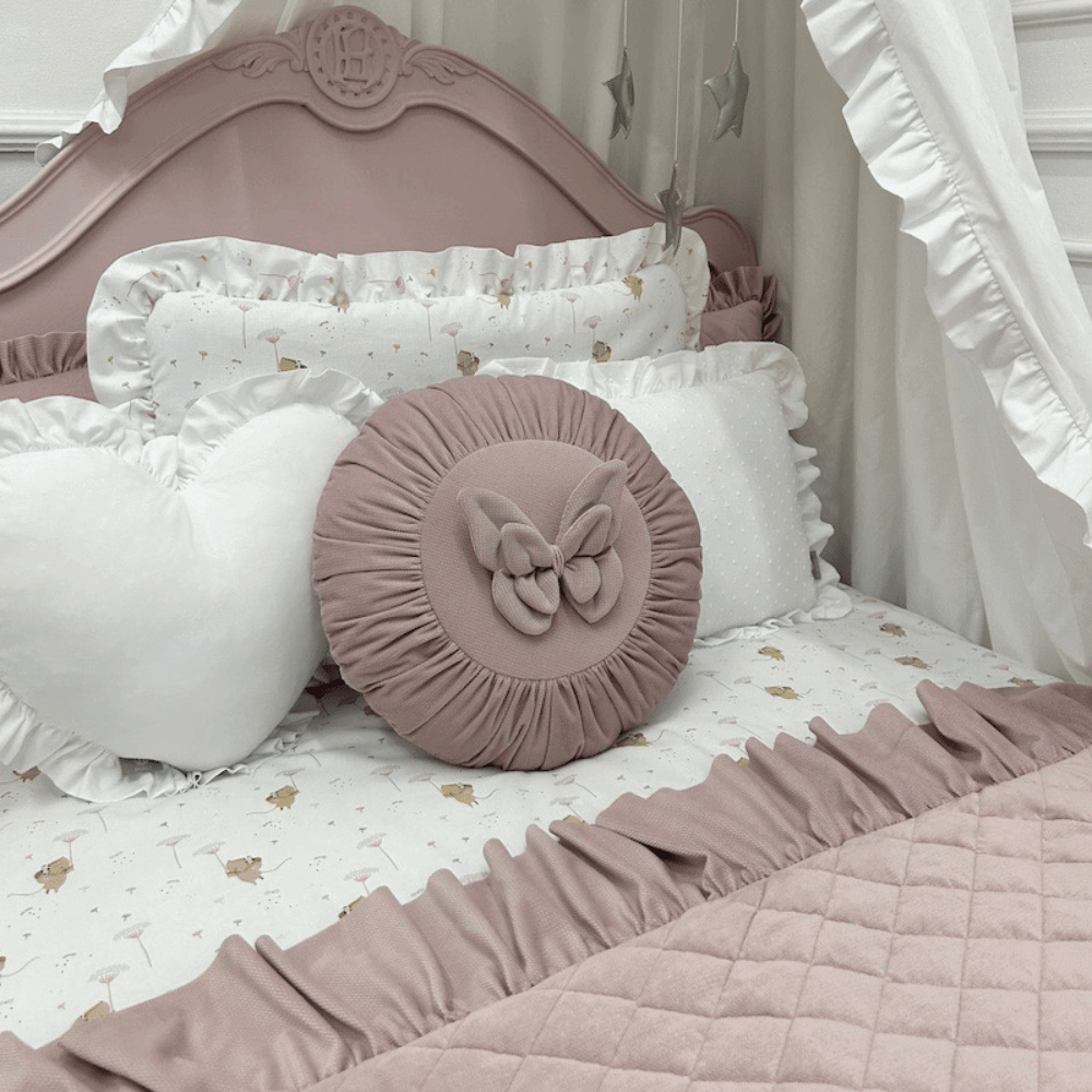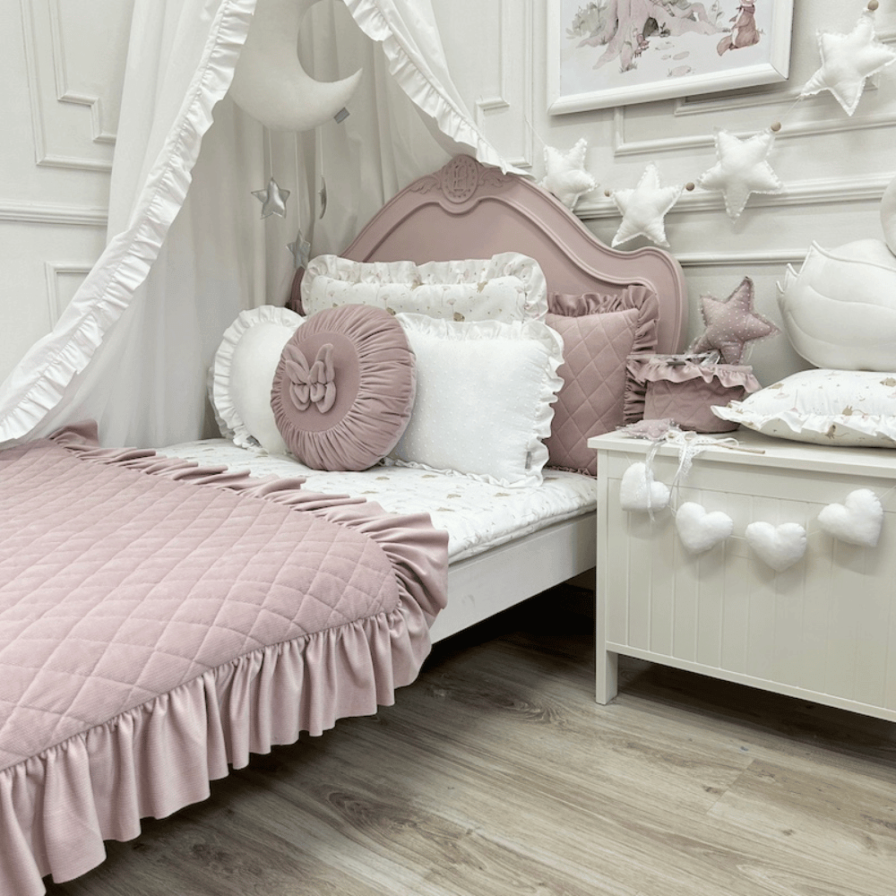 Rozmiar narzuty dotyczy samej części pikowanej. Do niego należy doliczyć dodatkowe 12 cm falbanki z każdej strony, która miękko opływa brzegi i nadaje całości niezwykle efektowny, lekki charakter. Falbanka subtelnie oprawia pikowane wnętrze, dodając mu delikatności i dziewczęcego uroku.