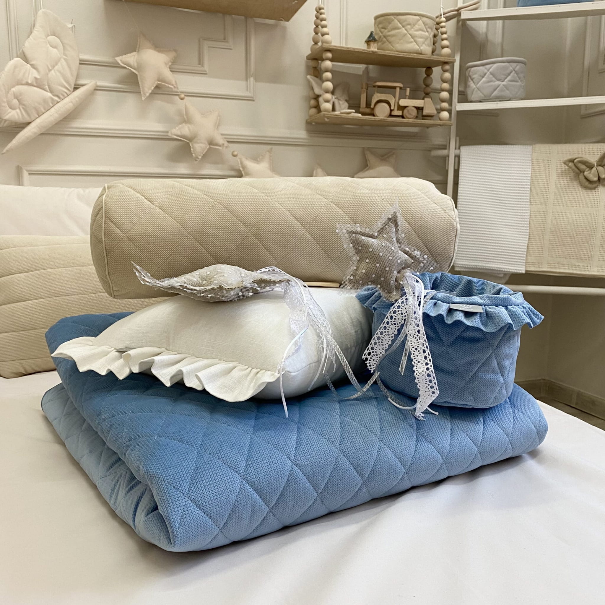 Narzuta została wykonana z wysokiej jakości, miękkiego aksamitu, który wyróżnia się delikatną fakturą oraz wyjątkową przyjemnością w dotyku. Materiał ten nie tylko pięknie się prezentuje, ale także zapewnia komfort codziennego użytkowania, co jest szczególnie ważne w przestrzeni przeznaczonej dla dziecka. Wierzchnia warstwa narzuty została starannie pikowana na 1,5-centymetrowej ocieplinie, dzięki czemu całość zachowuje odpowiednią puszystość, estetyczny wygląd i trwałą formę przez długi czas. Spód narzuty wykonano z gładkiego velvetu, dopasowanego kolorystycznie do wierzchniej warstwy, co zapewnia spójność wizualną oraz schludne wykończenie z każdej strony. Taka konstrukcja sprawia, że narzuta doskonale układa się na łóżeczku i nie przesuwa się podczas użytkowania.