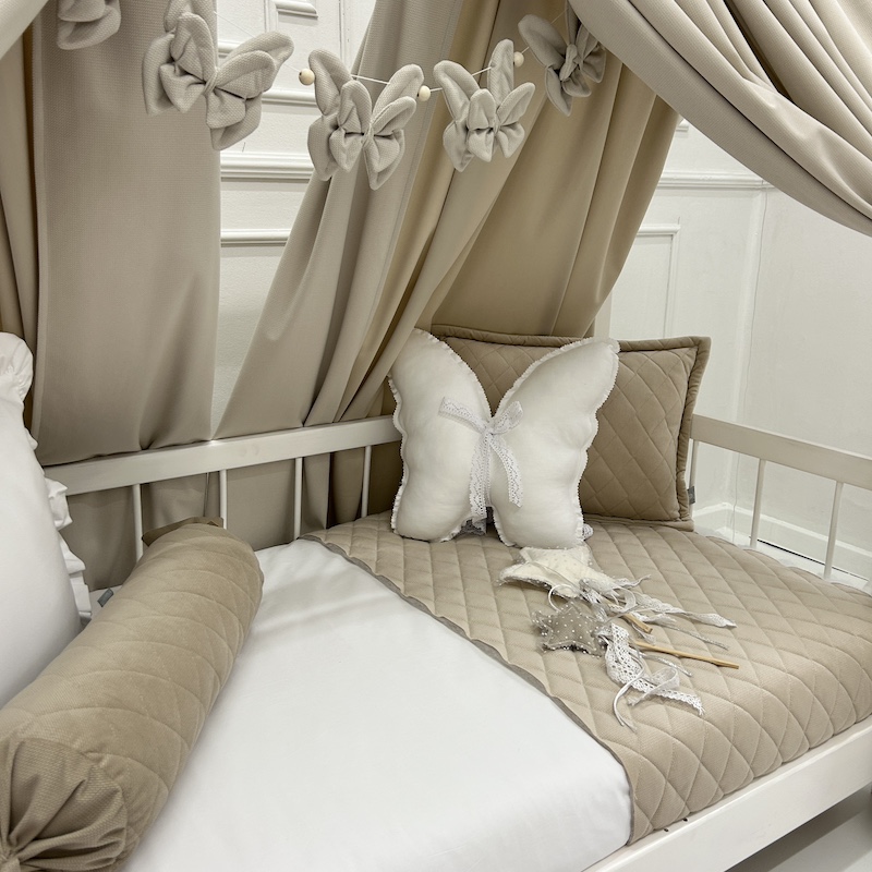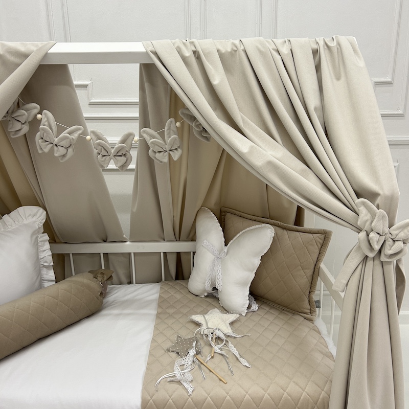 - Przytulna atmosfera – miękki, aksamitny materiał układa się w lekkie, zwiewne fałdy, tworząc subtelną osłonę nad łóżeczkiem. Dzięki temu dziecko ma swoje małe, intymne królestwo, w którym czuje się bezpiecznie i spokojnie. To idealna sceneria do zasypiania, czytania bajek czy odpoczynku w ciągu dnia.