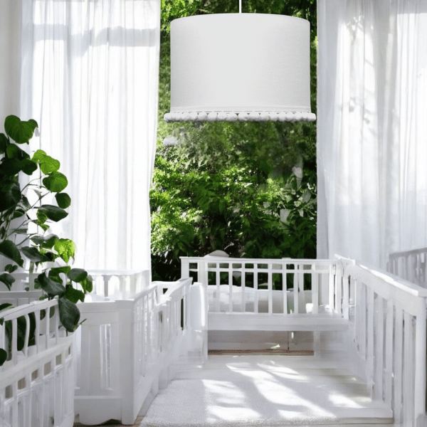 Większa wersja białej lampy sufitowej z uroczymi pomponami to idealne rozwiązanie do przestronniejszych wnętrz dziecięcych. Jasny abażur w neutralnym, ciepłym odcieniu beżu wprowadza do pokoju harmonię i spokój, tworząc przyjazną atmosferę do zabawy i odpoczynku. Lampa pięknie komponuje się z drewnianymi meblami, wikliną oraz pastelowymi dodatkami, dodając wnętrzu subtelnego uroku. Dzięki większym wymiarom zapewnia więcej światła, doskonale oświetlając całe pomieszczenie.