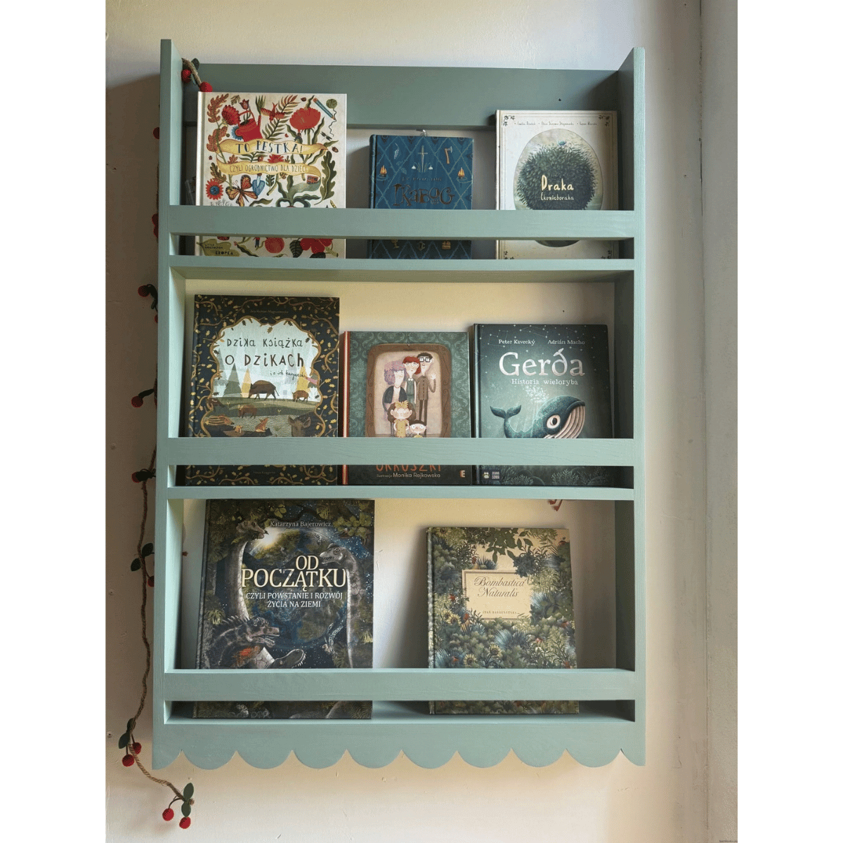 Biblioteczka ścienna dla dzieci – drewniana półka na książki Montessori z falbanką | lite drewno sosnowe