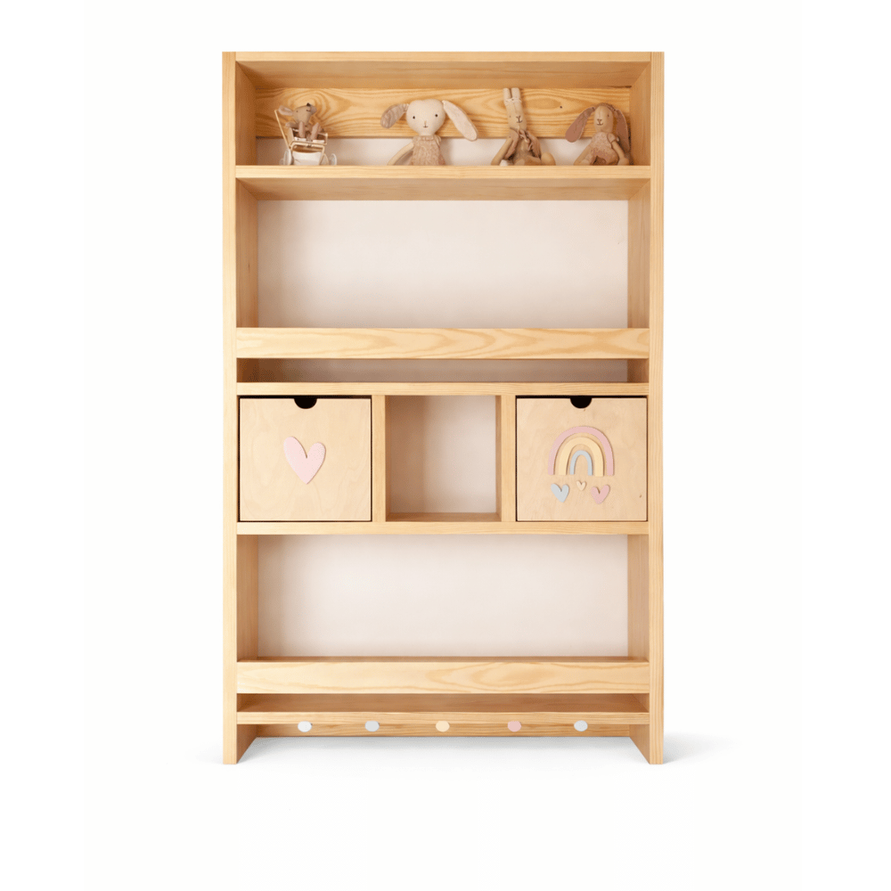 Przemyślana konstrukcja sprawia, że biblioteczka doskonale sprawdzi się jako miejsce na ulubione książeczki, zabawki, gry czy drobne skarby dziecka. Szufladki pozwalają schować mniejsze przedmioty, a wieszaczki są idealne na plecak do przedszkola, kurtkę czy torbę.