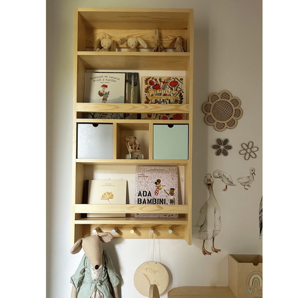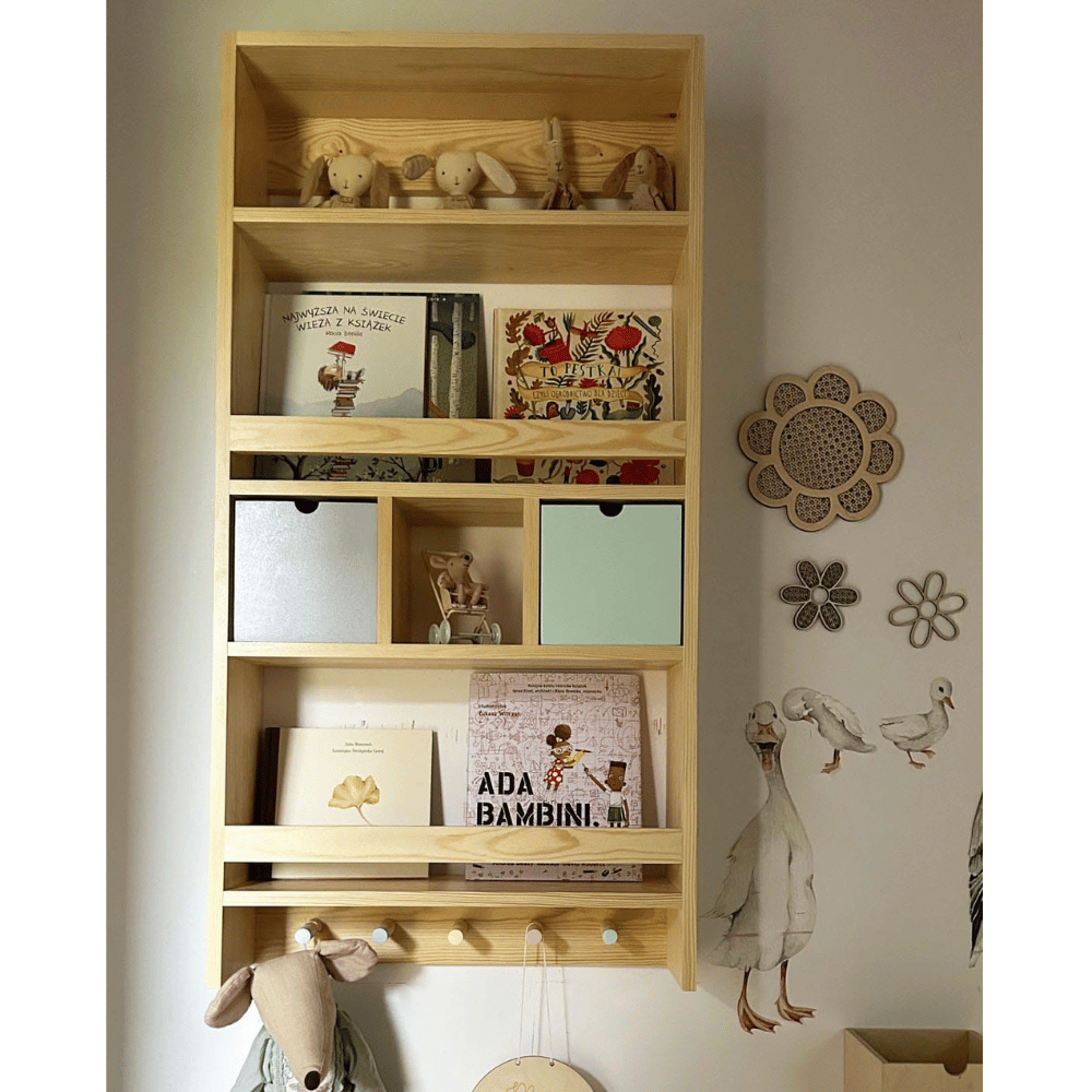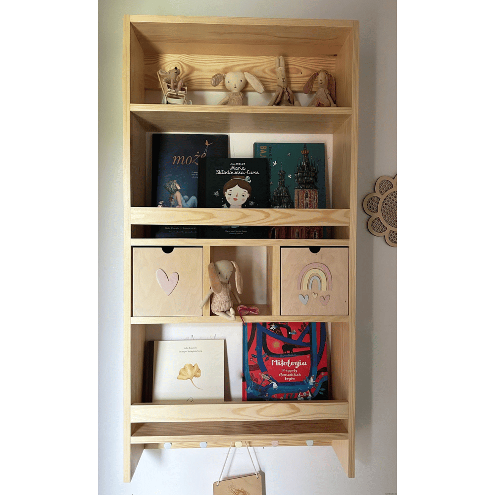 Biblioteczka wisząca z szufladkami i wieszakami to połączenie estetyki i funkcjonalności, które pomaga stworzyć uporządkowaną i przyjazną przestrzeń do nauki, zabawy oraz codziennego korzystania z książek.