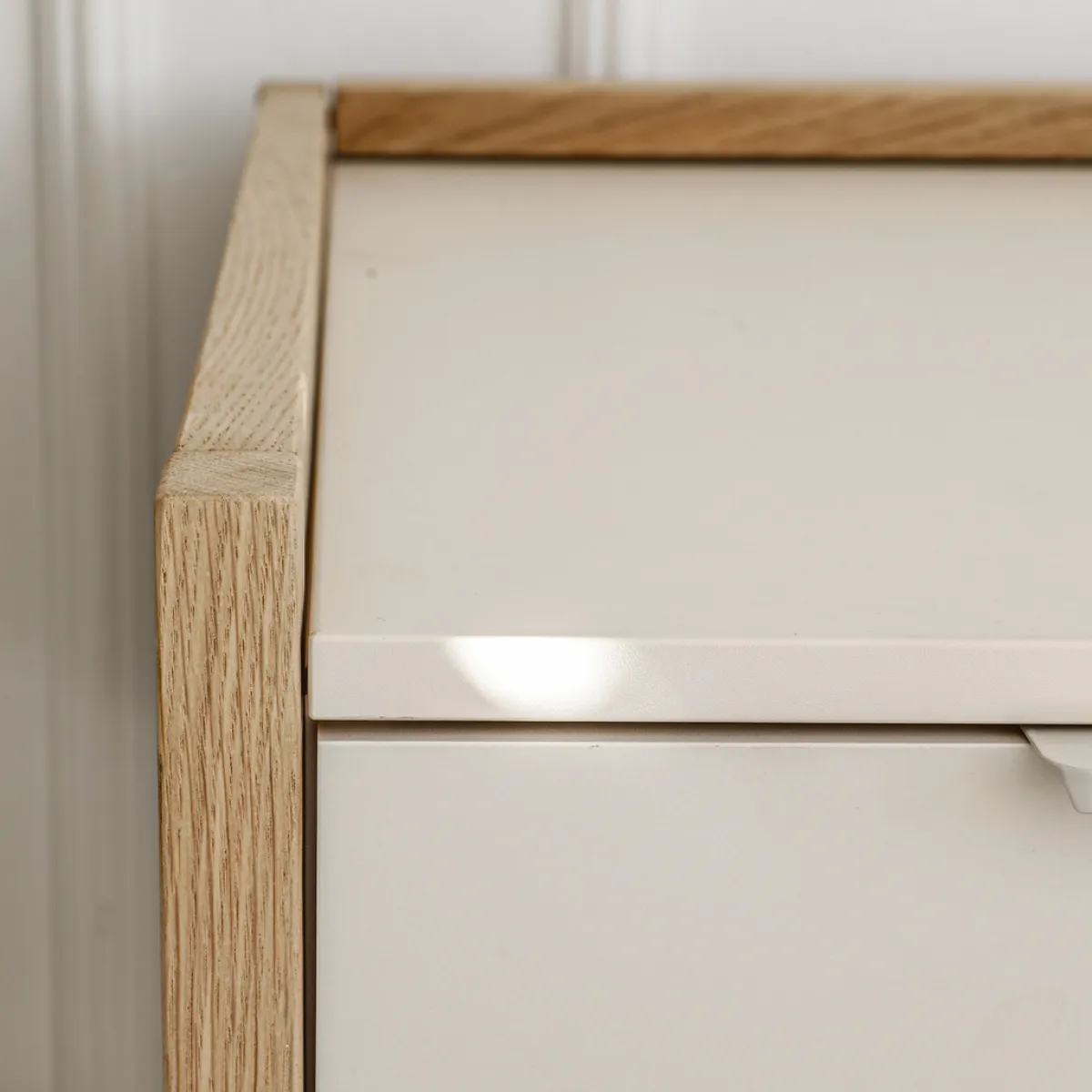 Połączenie płyty laminowanej i drewna dębowego gwarantuje stabilność, odporność oraz estetyczny wygląd nawet przy intensywnym codziennym użytkowaniu.