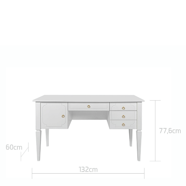 Biurko ma 132 cm szerokości, 60 cm głębokości i 77,6 cm wysokości.