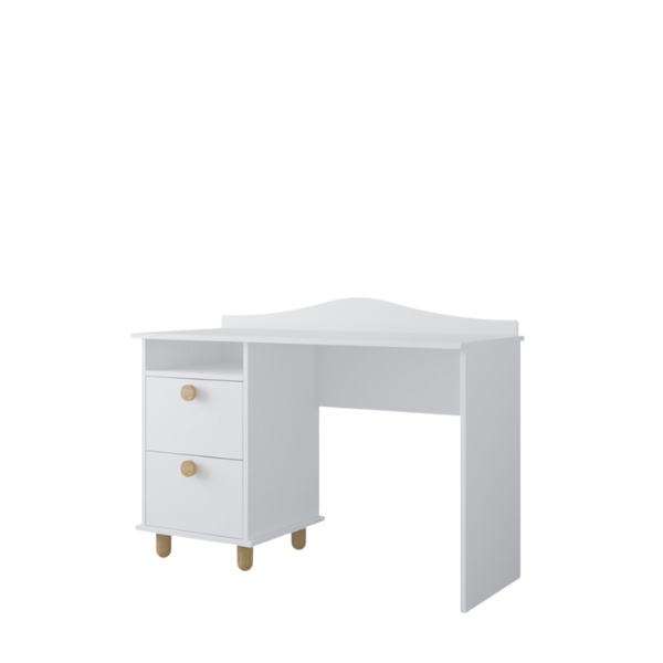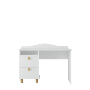 Szeroki blat o długości 121 cm daje dużo przestrzeni do nauki i zabawy, a jego zaokrąglona, dekoracyjna listwa z tyłu chroni ścianę przed zabrudzeniami. Po lewej stronie znajdują się dwie pojemne szuflady — idealne na zeszyty, kredki, akcesoria plastyczne i wszystkie skarby małego odkrywcy. Obok nich umieszczona jest praktyczna wnęka, w której zmieszczą się książki, zeszyty czy pojemniki na drobiazgi.