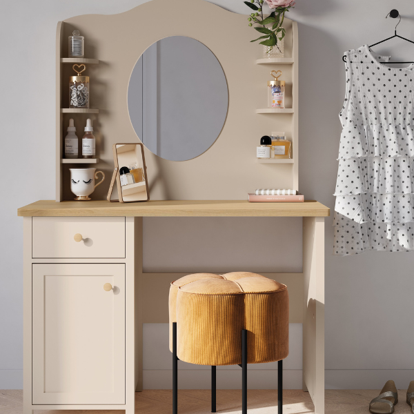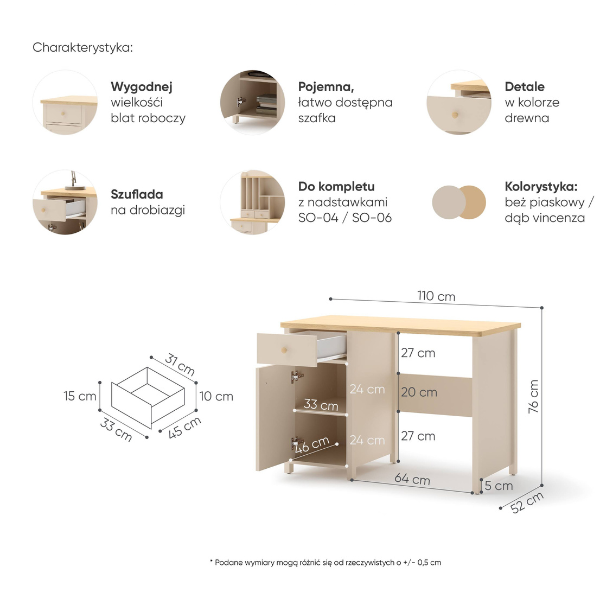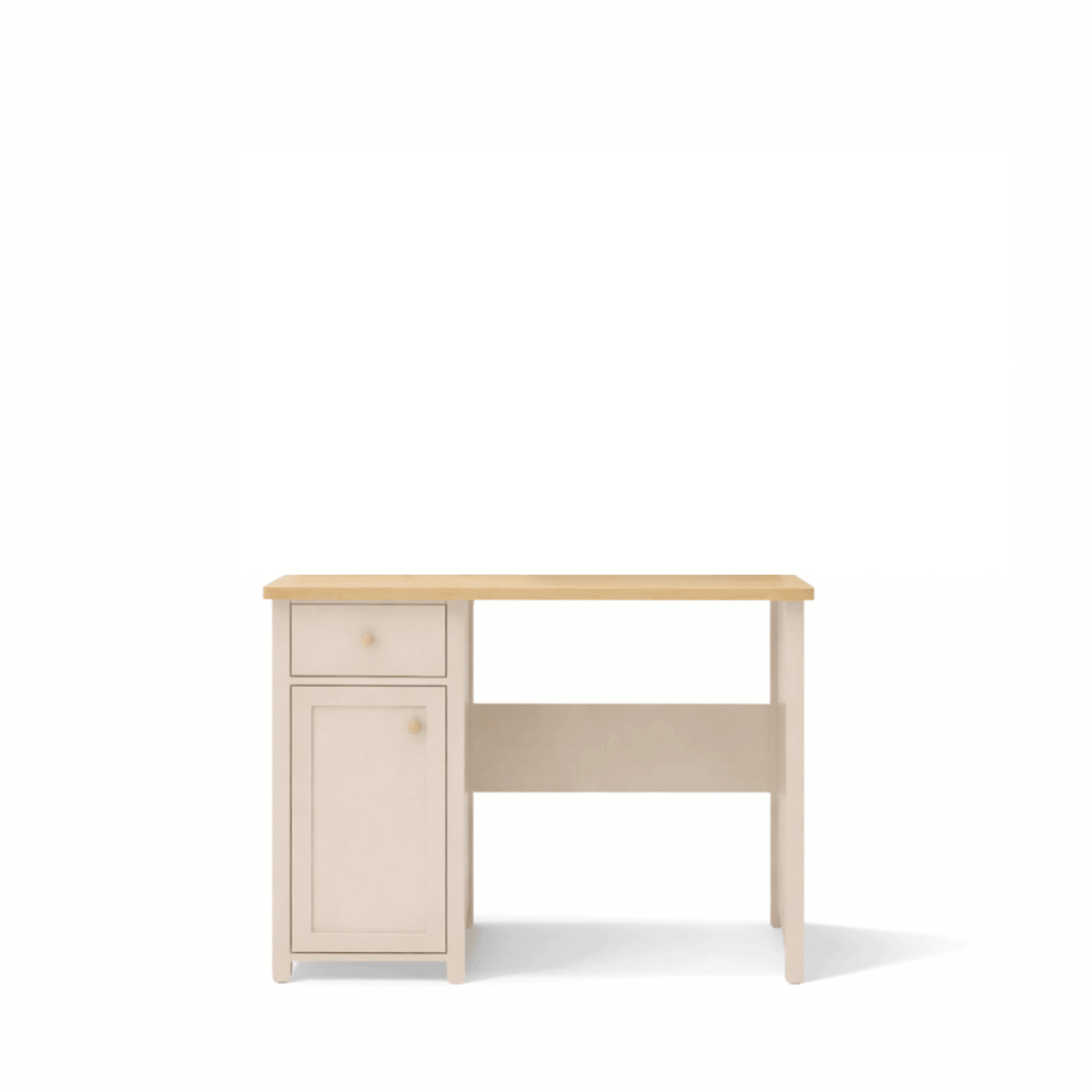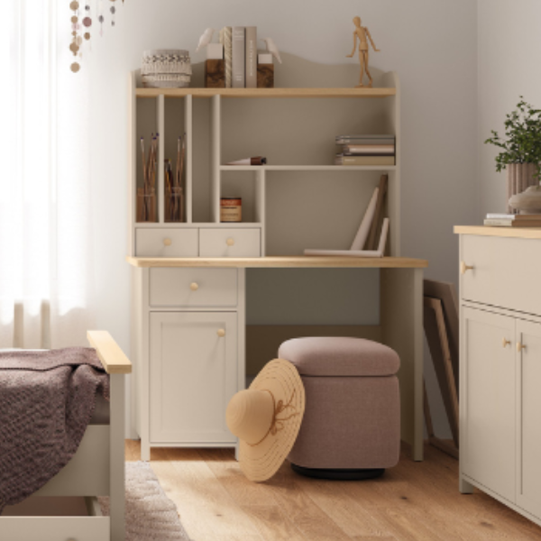 Ciepła kolorystyka beż piaskowy / dąb vincenza bielony wprowadza do wnętrza naturalny, przytulny klimat, dzięki czemu biurko doskonale komponuje się z pokojami urządzonymi w stylu boho, skandynawskim lub nowoczesnym. Subtelne połączenie barw sprawia, że mebel jest ponadczasowy i łatwo dopasować go do innych elementów kolekcji Story.