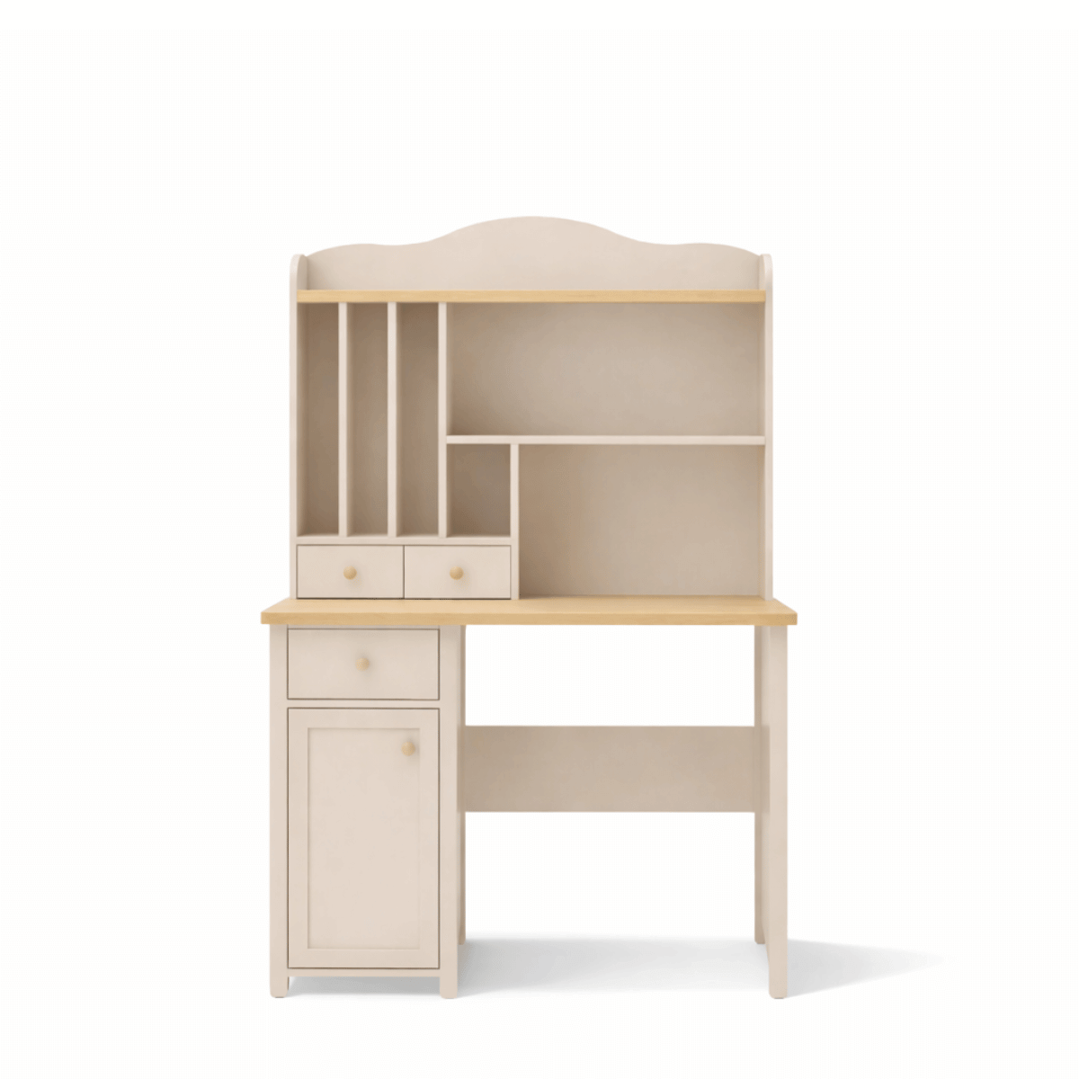 Biurko zostało wykonane z wysokiej jakości płyt meblowych, co gwarantuje trwałość i stabilność konstrukcji. Ciche prowadnice szuflad i precyzyjne wykończenie zapewniają komfort oraz bezpieczeństwo użytkowania. Dodatkowo istnieje możliwość dokupienia nadstawki z półkami i szufladkami lub nadstawki w formie toaletki z lusterkiem, dzięki czemu biurko można dopasować do indywidualnych potrzeb dziecka lub nastolatki.