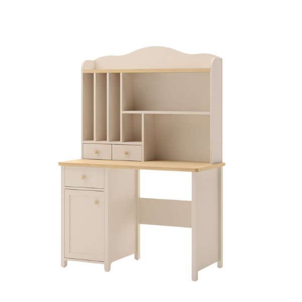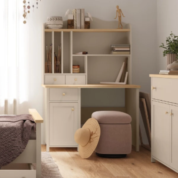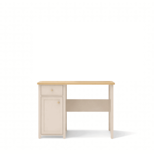 Biurko zostało wykonane z wysokiej jakości płyt meblowych, co gwarantuje trwałość i stabilność konstrukcji. Ciche prowadnice szuflad i precyzyjne wykończenie zapewniają komfort oraz bezpieczeństwo użytkowania. Dodatkowo istnieje możliwość dokupienia nadstawki z półkami i szufladkami lub nadstawki w formie toaletki z lusterkiem, dzięki czemu biurko można dopasować do indywidualnych potrzeb dziecka lub nastolatki.