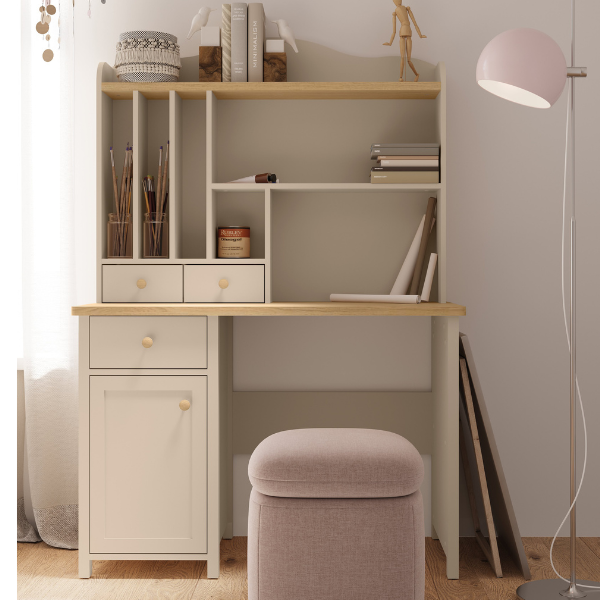 Ciepła kolorystyka beż piaskowy / dąb vincenza bielony wprowadza do wnętrza naturalny, przytulny klimat, dzięki czemu biurko doskonale komponuje się z pokojami urządzonymi w stylu boho, skandynawskim lub nowoczesnym. Subtelne połączenie barw sprawia, że mebel jest ponadczasowy i łatwo dopasować go do innych elementów kolekcji Story.