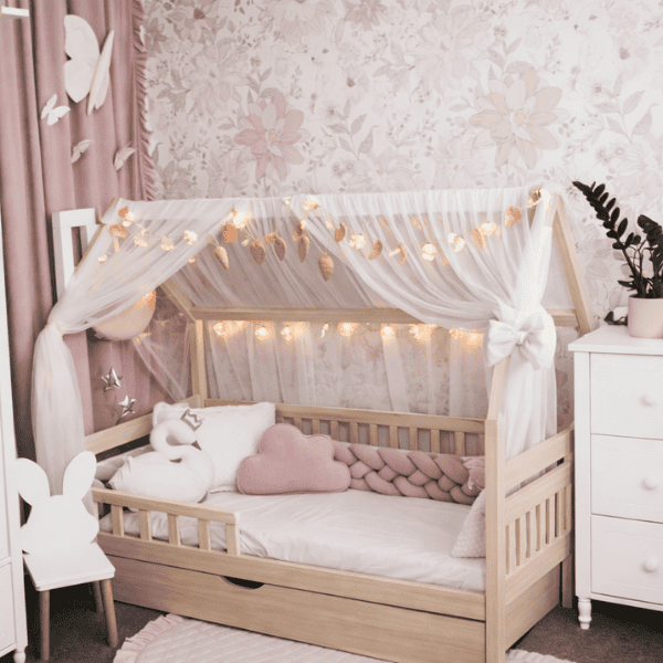 Łóżko Bukito w kształcie domku to połączenie trwałości, estetyki i funkcjonalności, które idealnie sprawdzi się w dziecięcym pokoju. Wykonane z naturalnego drewna bukowego, wyróżnia się solidną konstrukcją i wyjątkową wytrzymałością, co gwarantuje długie użytkowanie. Barierki ochronne zapewniają bezpieczeństwo podczas snu, a unikalny kształt domku tworzy przytulną przestrzeń sprzyjającą zarówno wypoczynkowi, jak i kreatywnej zabawie. Łóżko posiada również pojemną szufladę, idealną do przechowywania pościeli, zabawek czy książek, co pomaga utrzymać porządek w pokoju. Domkowy design doskonale pasuje do różnych stylów wnętrz.