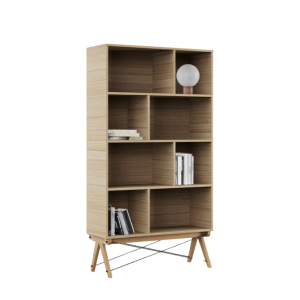 Regał został zaprojektowany i wykonany ręcznie w rodzinnej manufakturze MINKO, z najwyższej jakości materiałów: naturalnego forniru dębowego lub orzechowego oraz drewnianych nóg z buku lub dębu. Charakterystyczne druciki spinające nóżki pełnią funkcję konstrukcyjną i estetyczną, dodając regałowi lekkości i oryginalnego wyglądu.