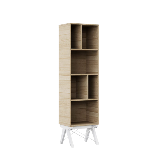 Styl regału inspirowany jest skandynawskim wzornictwem – łączy klasyczną prostotę z nowoczesną formą, dzięki czemu idealnie wpasuje się zarówno w dziecięcy, jak i młodzieżowy wystrój pokoju. Charakterystycznym elementem są drewniane nogi z buku lub dębu, które dodają konstrukcji lekkości, a metalowe druciki spinające je od dołu – dekoracyjnego sznytu i stabilności.