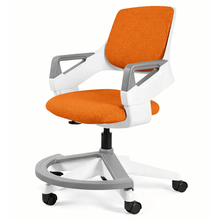- podnóżek dla małych dzieci – komfort od pierwszych lat Umieszczony na wysokości 14 cm od podłoża, pozwala wygodnie oprzeć stopy nawet przedszkolakom. Zakres odległości podnóżek–siedzisko: 24–36 cm. Dla starszych dzieci – możliwość ustawienia krzesła tak, by podnóżek nie przeszkadzał w opieraniu nóg o podłogę.