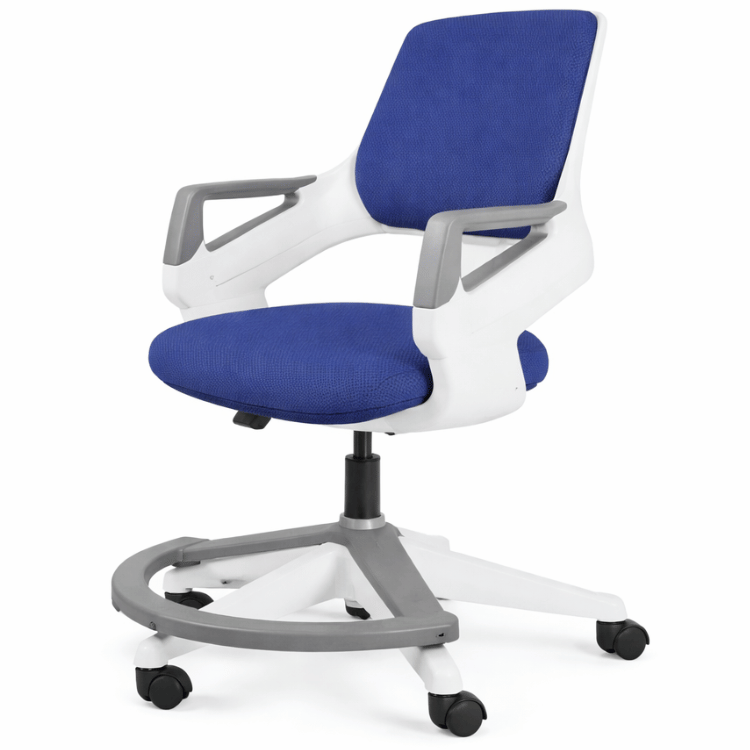 - podnóżek dla małych dzieci – komfort od pierwszych lat Umieszczony na wysokości 14 cm od podłoża, pozwala wygodnie oprzeć stopy nawet przedszkolakom. Zakres odległości podnóżek–siedzisko: 24–36 cm. Dla starszych dzieci – możliwość ustawienia krzesła tak, by podnóżek nie przeszkadzał w opieraniu nóg o podłogę.