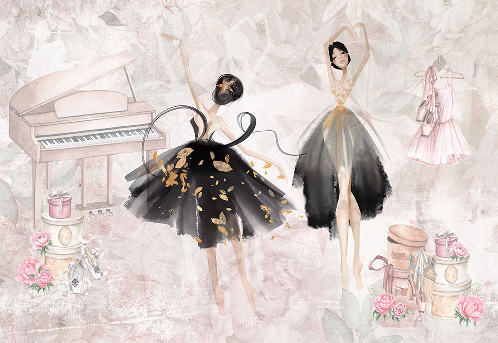 Tło tapety utrzymane jest w jasnych, pastelowych odcieniach z subtelną, akwarelową fakturą, która pięknie dopełnia całość i nie przytłacza wnętrza. Wkomponowane elementy baletowego świata – fortepian, baletki, tiulowe spódniczki czy dekoracyjne pudełka – budują spójną, artystyczną opowieść i pobudzają wyobraźnię. Złote detale dodają tapecie delikatnego blasku oraz elegancji, zachowując jednocześnie lekkość i subtelność formy.