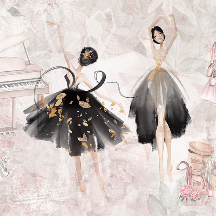 to elegancka i artystyczna dekoracja ścienna, która wprowadza do wnętrza atmosferę lekkości, gracji i subtelnego piękna świata baletu. Delikatne ilustracje baletnic w zwiewnych, czarnych tutu ozdobionych złotymi akcentami przyciągają wzrok i nadają przestrzeni wyrafinowany, poetycki charakter. Postacie tancerek uchwycone w ruchu sprawiają wrażenie eterycznych i lekkich, jakby unosiły się w powietrzu, tworząc harmonijną i spokojną kompozycję.