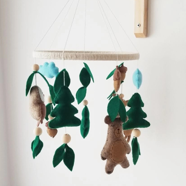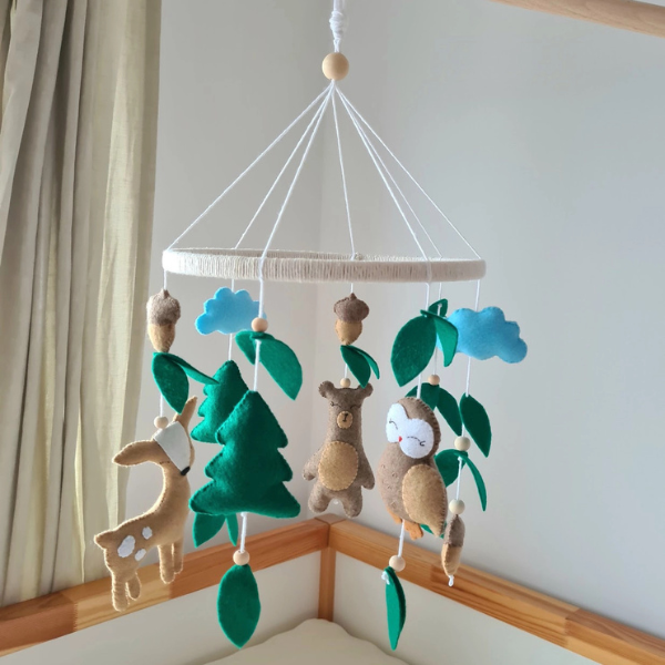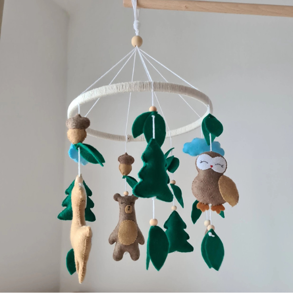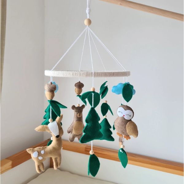 Karuzela do łóżeczka Leśna ze zwierzątkami przeniesie Twoje Maleństwo w magiczny świat zielonego lasu, pełnego spokoju i naturalnego uroku. Wśród miękkich, filcowych liści i drobnych żołędzi krążą urocze leśne zwierzątka – sowa, miś i jelonek – które wylegują się pod błękitnym niebem. Każdy element został ręcznie wykonany z wysokiej jakości filcu i wełny czesankowej, a wnętrze wypełniono antyalergicznym materiałem, dzięki czemu karuzela jest w pełni bezpieczna nawet dla najmłodszych dzieci.