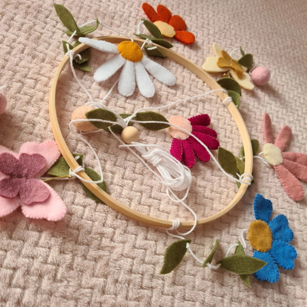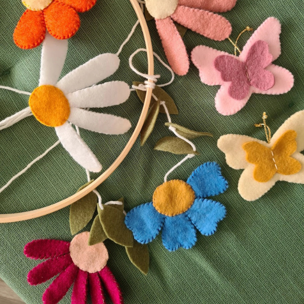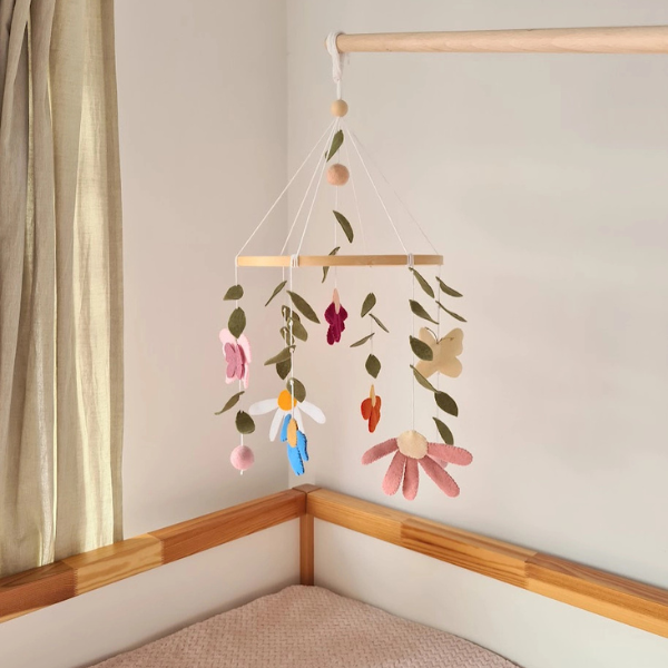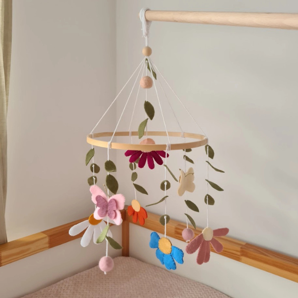 Karuzela do łóżeczka Powiew wiosny to pełna lekkości i koloru dekoracja, która przeniesie Twoje Maleństwo w świat delikatnych kwiatów i fruwających motyli. Barwna, wiosenna kompozycja wprowadza do pokoju dziecka radość, świeżość i naturalny urok, tworząc przyjemne otoczenie sprzyjające relaksowi i spokojnemu zasypianiu. Każdy element został ręcznie wykonany z wysokiej jakości filcu i wełny czesankowej, z niezwykłą dbałością o detale, dzięki czemu karuzela zachwyca zarówno pięknem, jak i starannością wykonania.