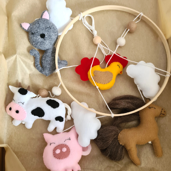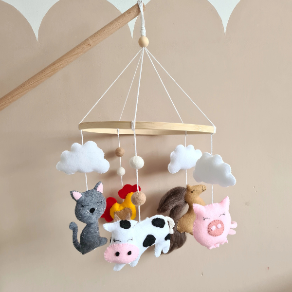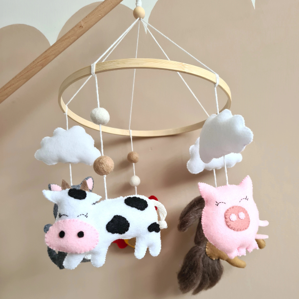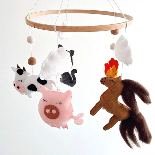 Karuzela do łóżeczka Zwierzęta Gospodarskie to radosna i kolorowa dekoracja, która przeniesie Twoje Maleństwo w sielski świat wiejskiego gospodarstwa. Wśród puszystych, białych chmurek krążą urocze, filcowe zwierzątka – konik, świnka, krowa, kot i kura – tworząc wesołą scenkę pełną życia i pozytywnej energii. Każdy z bohaterów został wykonany z dbałością o najdrobniejsze szczegóły, by nie tylko zachwycać wyglądem, ale też pobudzać ciekawość i wyobraźnię dziecka.
