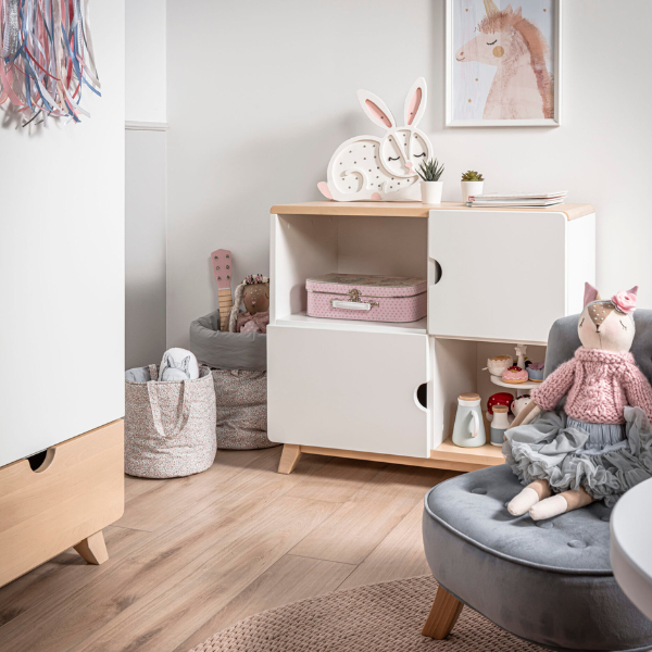 Komoda 2-drzwiowa szeroka MINIMONDO Prosta forma, funkcjonalność i urok skandynawskiego wzornictwa – ta szeroka, dwudrzwiowa komoda z kolekcji Minimondo to idealne rozwiązanie do każdego dziecięcego pokoju. Może być ustawiona zarówno pod łóżkiem podniesionym Minimondo, jak i pełnić rolę samodzielnego mebla. Za frontami z systemem cichego domyku znajduje się przestrzeń idealna do przechowywania, natomiast dwie otwarte półki doskonale sprawdzą się do wyeksponowania książek, zabawek czy ulubionych dekoracji.