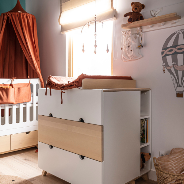 Duża komoda z trzema pojemnymi szufladami to idealne rozwiązanie do dziecięcego pokoju. Szuflady poruszają się na ukrytych prowadnicach z systemem cichego domyku, zapewniając komfort użytkowania i bezpieczeństwo najmłodszych. Pomieszczą wszystko, co ważne – od ubranek i zabawek po książki i inne dziecięce skarby. Subtelne połączenie skośnych nóżek z ramiakami nadaje meblowi wizualnej lekkości, a jednocześnie gwarantuje jego stabilność i trwałość. Dodatkowym atutem komody jest możliwość zamontowania dedykowanego przewijaka z półkami – dzięki temu staje się praktycznym meblem, który rośnie razem z dzieckiem i służy od pierwszych dni życia.