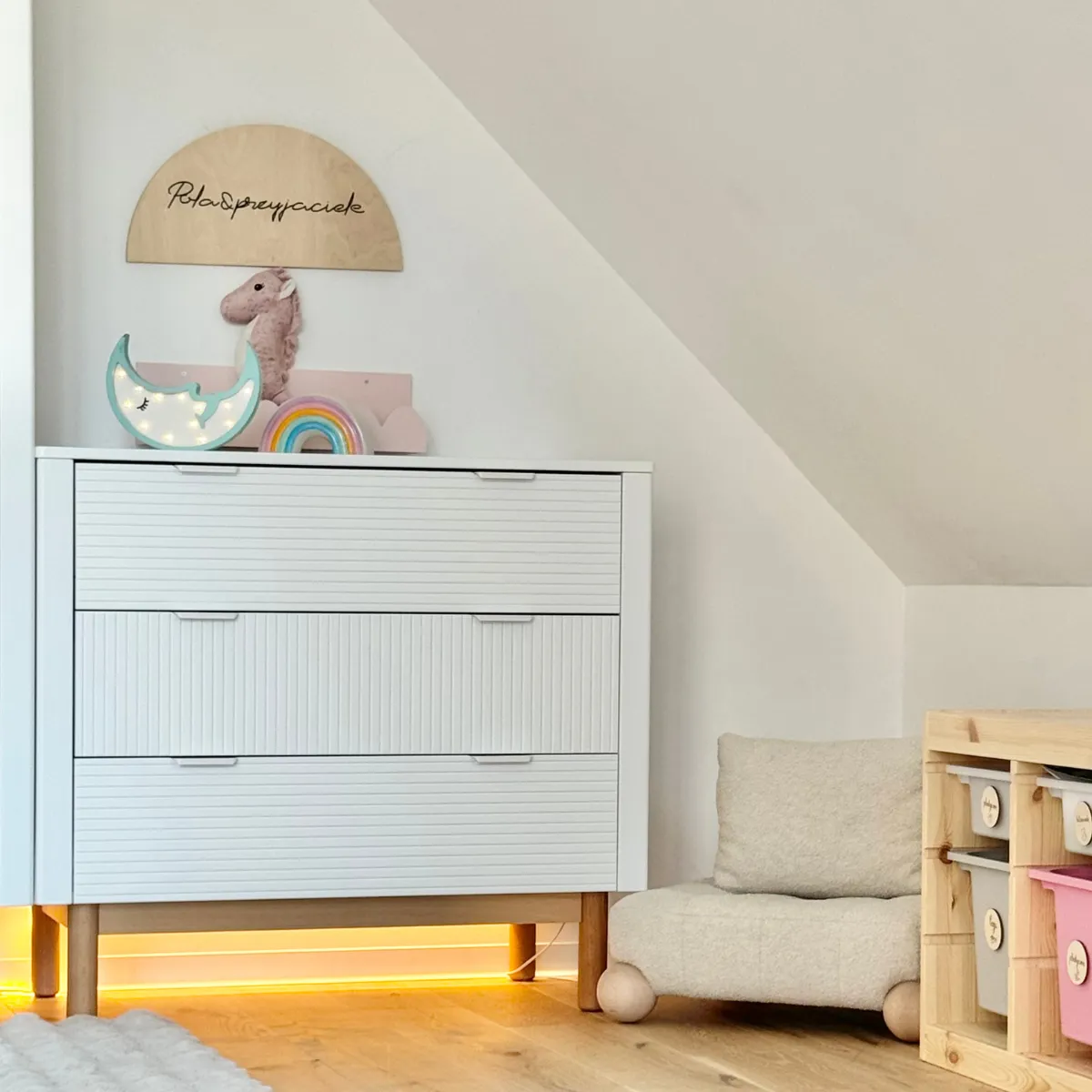 Trzy pojemne i wygodne szuflady zapewniają dużą przestrzeń do przechowywania ubranek, tekstyliów i dziecięcych akcesoriów. To praktyczna biała komoda dziecięca, która realnie pomaga utrzymać porządek każdego dnia.