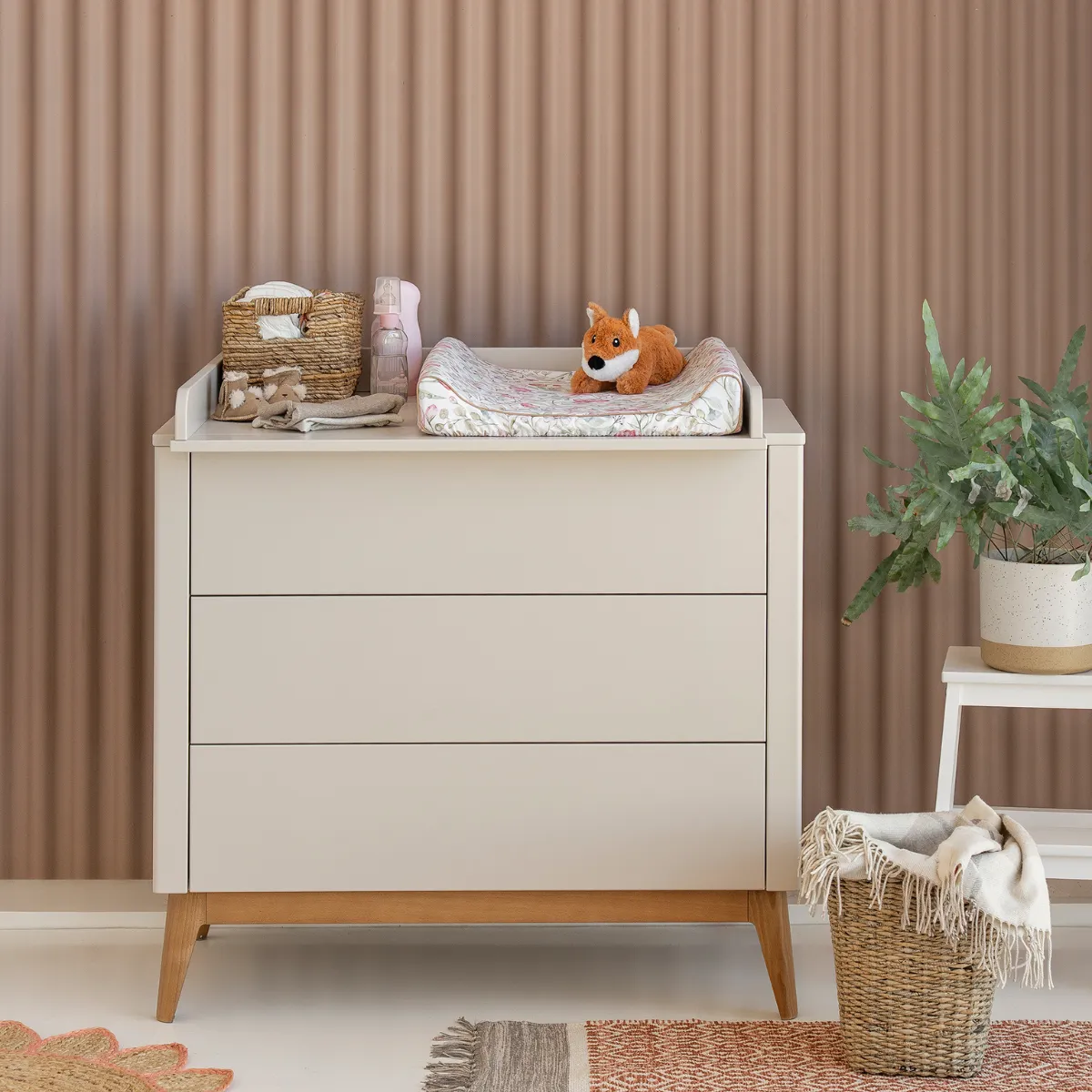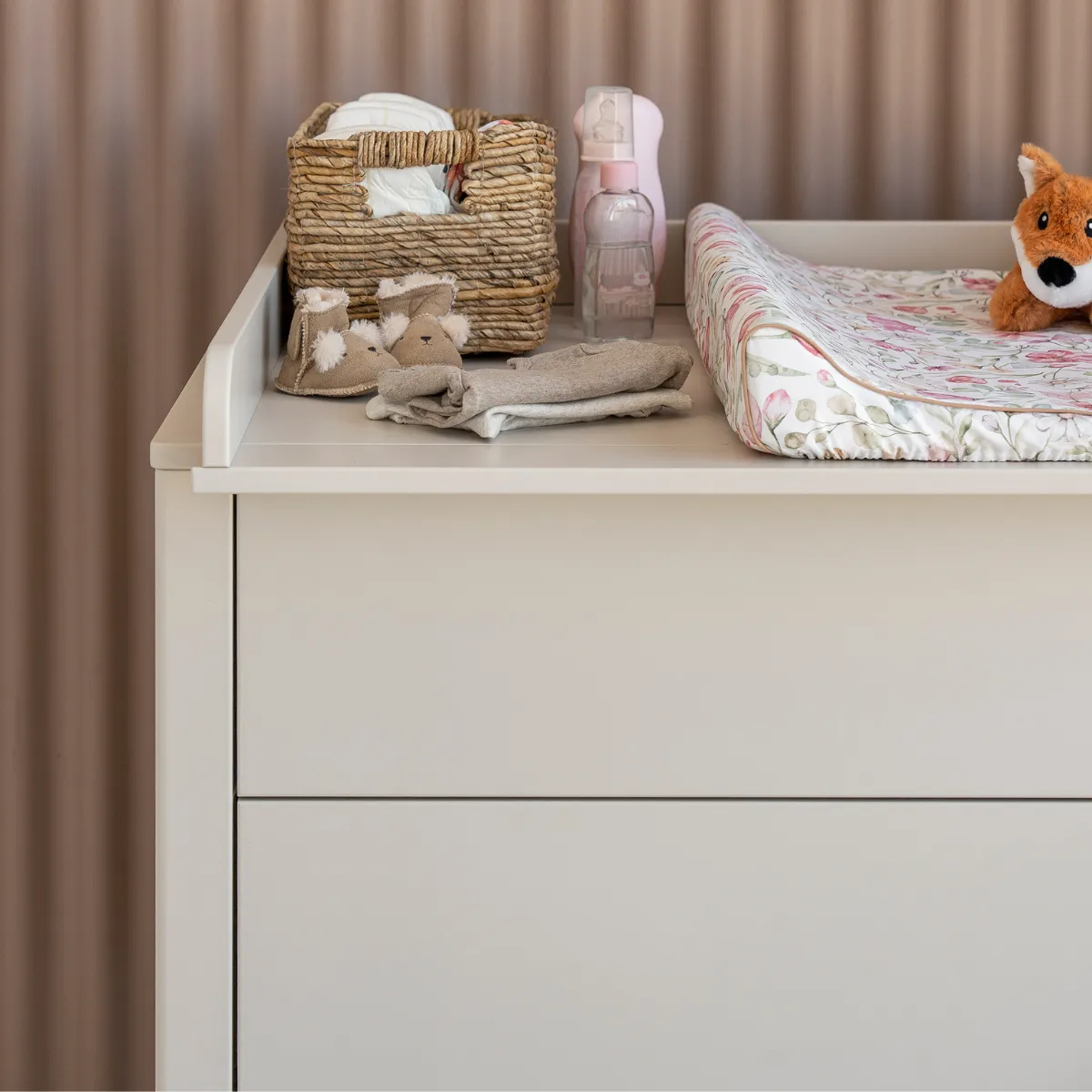 Dodatkową zaletą jest możliwość dokupienia nakładki do przewijania, dzięki której komoda może pełnić również funkcję praktycznego miejsca do codziennej pielęgnacji malucha. Po zdjęciu przewijaka mebel nadal pozostaje w pełni funkcjonalną komodą na kolejne lata.
