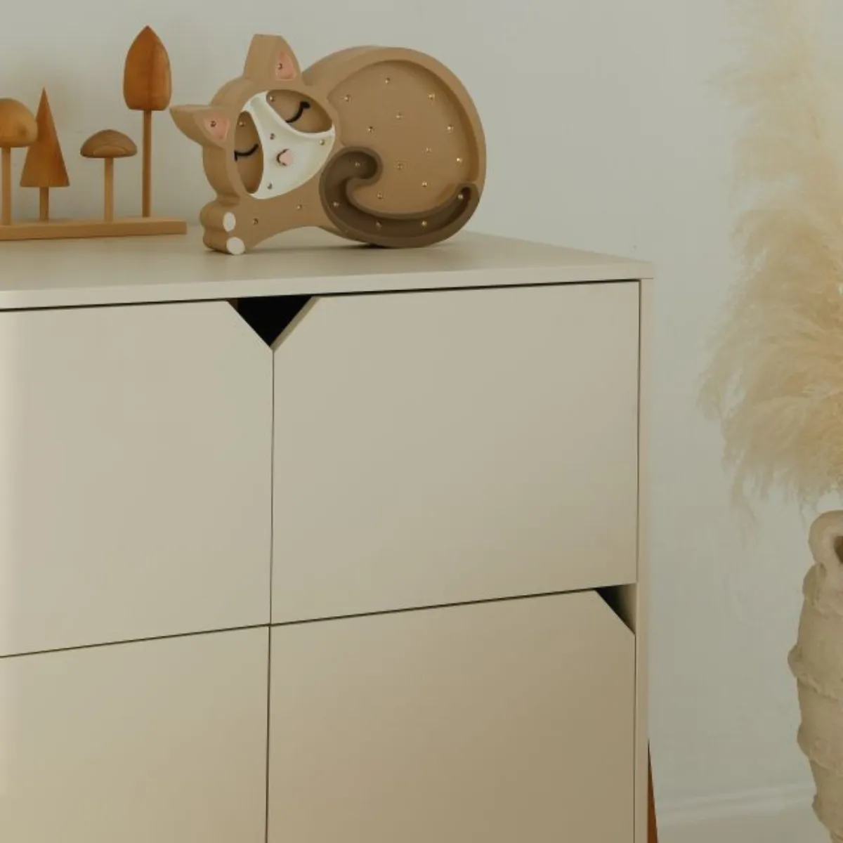 Blat komody można uzupełnić o opcjonalny przewijak z kolekcji Lotta, montowany po lewej, prawej lub na środku – tworząc wygodne miejsce do pielęgnacji niemowlaka, gdy tego potrzebujesz, lub korzystać z komody bez przewijaka.