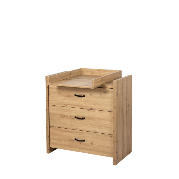 Komoda została wyposażona w trzy pojemne szuflady, które pomieszczą wszystkie niezbędne rzeczy — od dziecięcych ubranek, przez akcesoria, po zabawki czy tekstylia. Każda z szuflad osadzona jest na kulkowych prowadnicach, co zapewnia ich płynne i ciche otwieranie, nawet przy codziennym intensywnym użytkowaniu. Dodatkowym atutem jest możliwość wyposażenia komody w nakładkę do przewijania, dzięki czemu mebel może pełnić również rolę praktycznego przewijaka — idealnego dla rodziców niemowląt, ceniących sobie wygodę i ergonomię codziennej opieki nad dzieckiem.