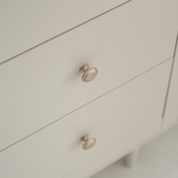 Złote uchwyty, lekkie bukowe nóżki i dopracowane proporcje sprawiają, że komoda idealnie wpisuje się w styl nowoczesny, japandi, skandynawski i klasyczny.