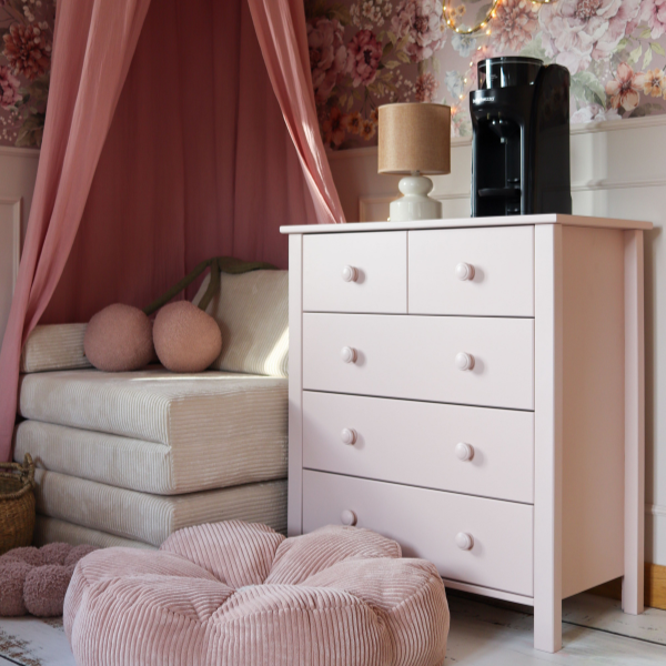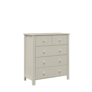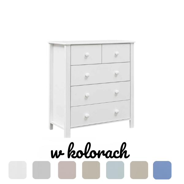 Klasyczny, prosty kształt komody inspirowany stylem skandynawskim został wzbogacony o pięć pojemnych szuflad, które pomieszczą ubrania, bieliznę, zabawki czy artykuły codziennego użytku. To mebel, który sprawdzi się na każdym etapie rozwoju dziecka – od niemowlaka po nastolatka – pomagając utrzymać porządek i dobrą organizację przestrzeni.