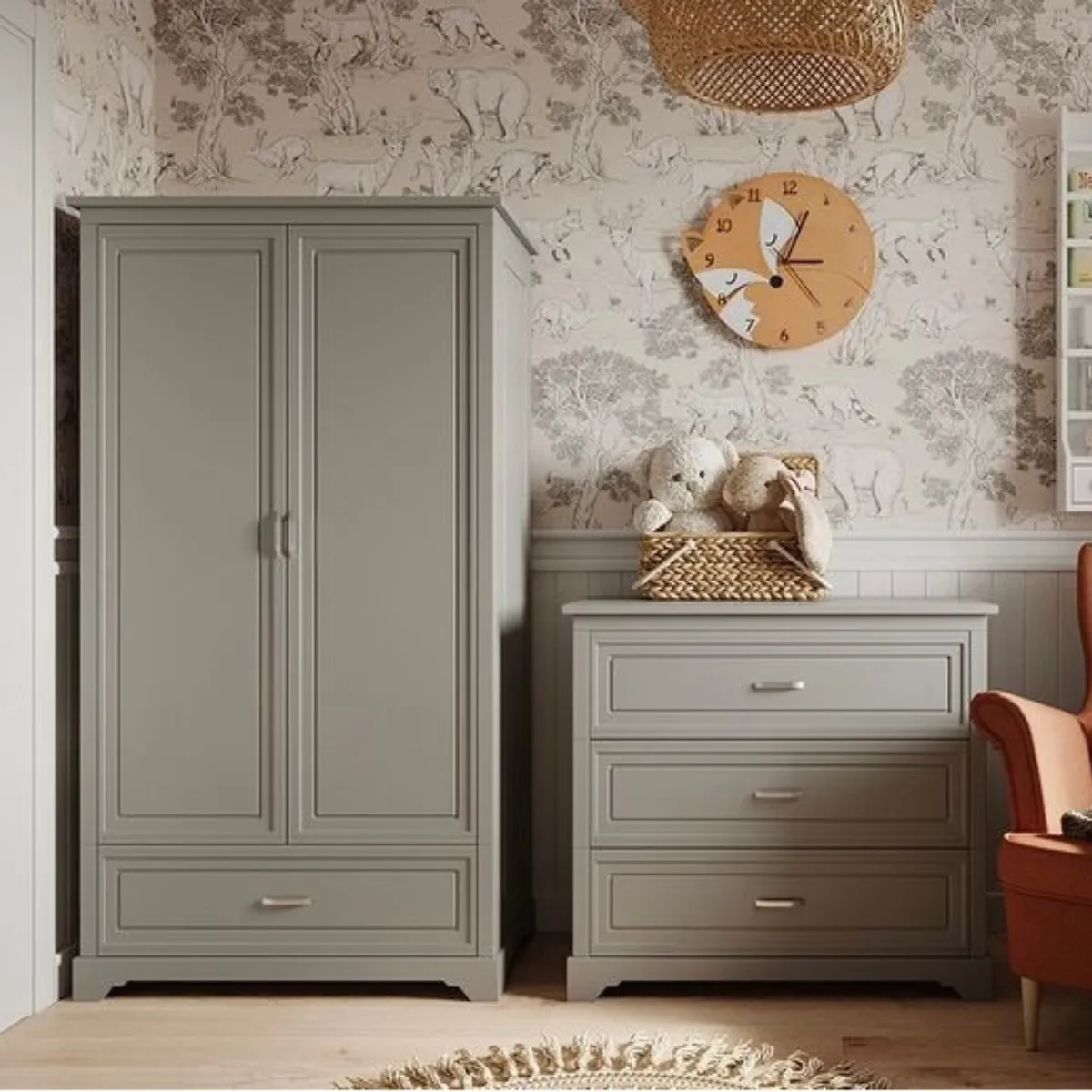 Klasyczna forma, szary kolor i subtelne detale sprawiają, że mebel pasuje zarówno do przytulnych, jak i bardziej eleganckich wnętrz dziecięcych.