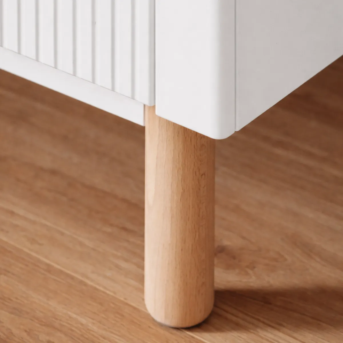 Ryflowane fronty, subtelne uchwyty oraz bukowe nóżki nadają meblowi lekkości i elegancji, tworząc spójny, ponadczasowy design.