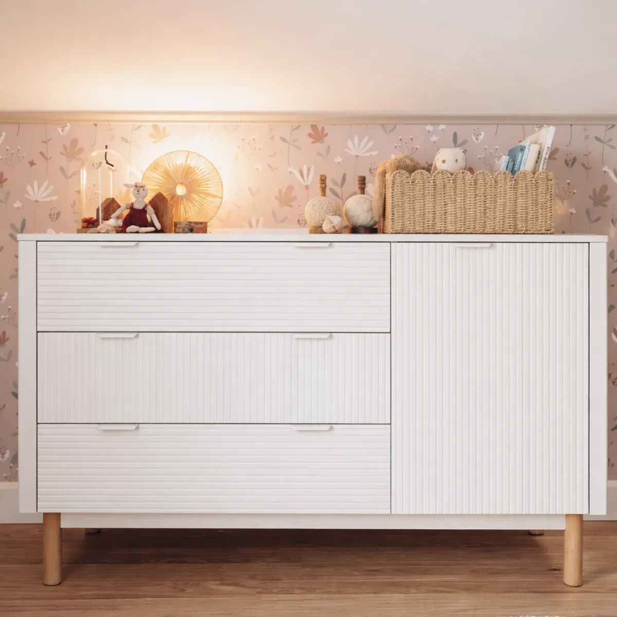 Trzy pojemne szuflady oraz dodatkowa szafka z drzwiami zapewniają jeszcze więcej miejsca na przechowywanie ubranek, tekstyliów i akcesoriów dziecięcych. To wyjątkowo funkcjonalna komoda dziecięca, która ułatwia organizację przestrzeni każdego dnia.