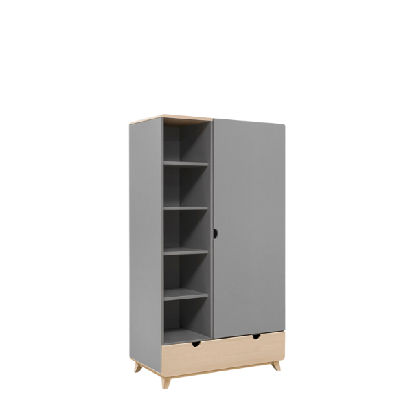 Komoda z regałem MINIMONDO Kompaktowa i wielofunkcyjna – komoda z regałem to doskonałe rozwiązanie do dziecięcego pokoju, w którym liczy się każdy centymetr przestrzeni. Dzięki niższej konstrukcji dziecko ma łatwy dostęp do wszystkich przechowywanych rzeczy. Otwarta część pełniąca rolę regału świetnie sprawdzi się do ekspozycji książek, zabawek czy dekoracji, a wbudowany drążek umożliwia przechowywanie odzieży w wygodny sposób. Poniżej znajduje się pojemna szuflada, a całość porusza się płynnie na ukrytych metalowych prowadnicach z systemem cichego domyku