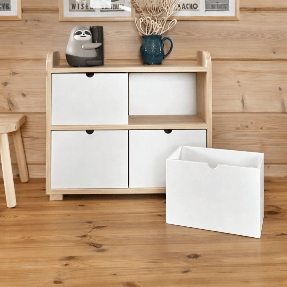 Kontenerek z czterema szufladami to funkcjonalny i estetyczny mebel, który doskonale sprawdzi się w pokoju dziecka. Dzięki kompaktowej formie i dużej pojemności pomaga utrzymać porządek oraz wygodnie przechowywać zabawki, książki i dziecięce akcesoria.