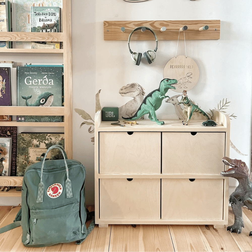 Dużą zaletą mebla jest jego uniwersalność. Gdy dziecko podrośnie i zmienią się jego potrzeby, kontenerek można łatwo przekształcić w regał na książki. Wystarczy wyjąć szuflady, aby powstała otwarta przestrzeń idealna do przechowywania książek, albumów czy dekoracji.