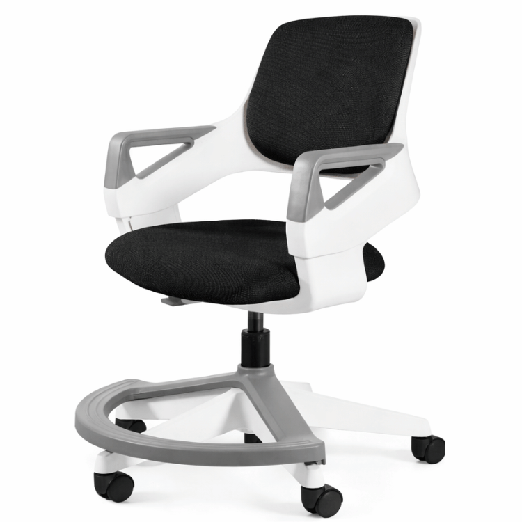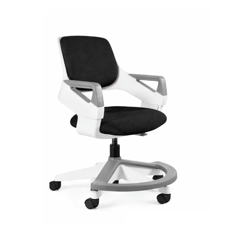 - podnóżek dla małych dzieci – komfort od pierwszych lat Umieszczony na wysokości 14 cm od podłoża, pozwala wygodnie oprzeć stopy nawet przedszkolakom. Zakres odległości podnóżek–siedzisko: 24–36 cm. Dla starszych dzieci – możliwość ustawienia krzesła tak, by podnóżek nie przeszkadzał w opieraniu nóg o podłogę.