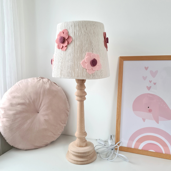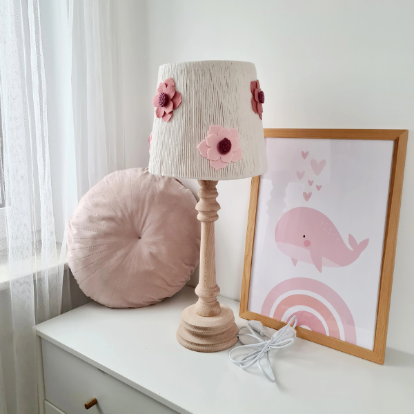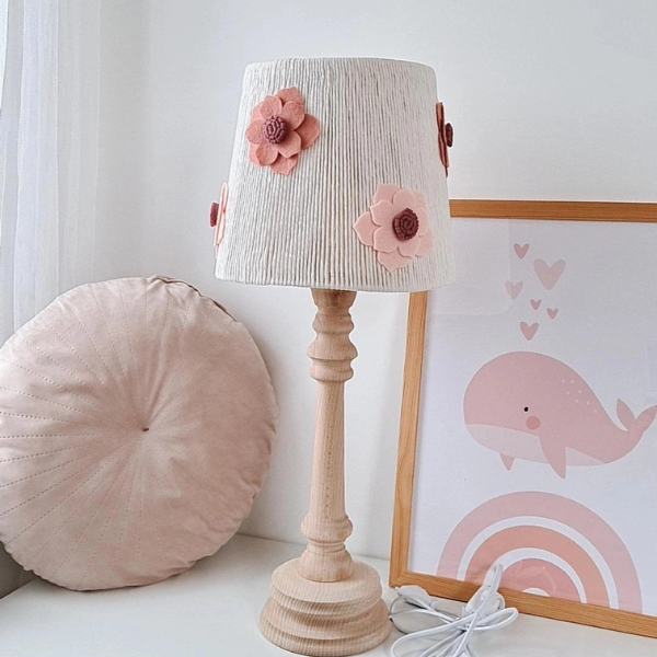 Klosz lampki został ozdobiony sześcioma dużymi filcowymi kwiatami w dwóch odcieniach – jasnoróżowym i brudnoróżowym. Delikatne kolory oraz miękka faktura filcu nadają jej dziewczęcego uroku i lekkości. Każdy egzemplarz powstaje w 100% ręcznie w Polsce, z dbałością o każdy detal, co czyni go unikatowym dodatkiem do dziecięcego pokoju.