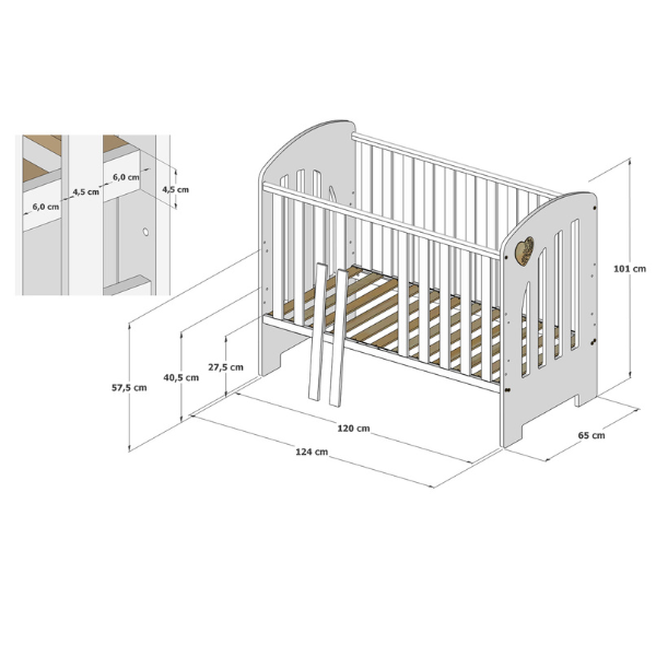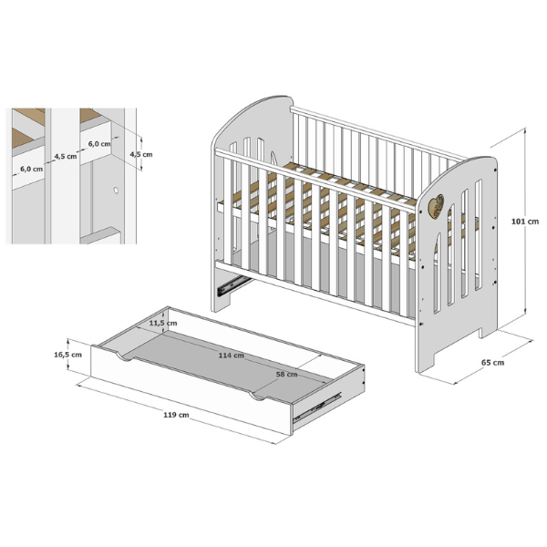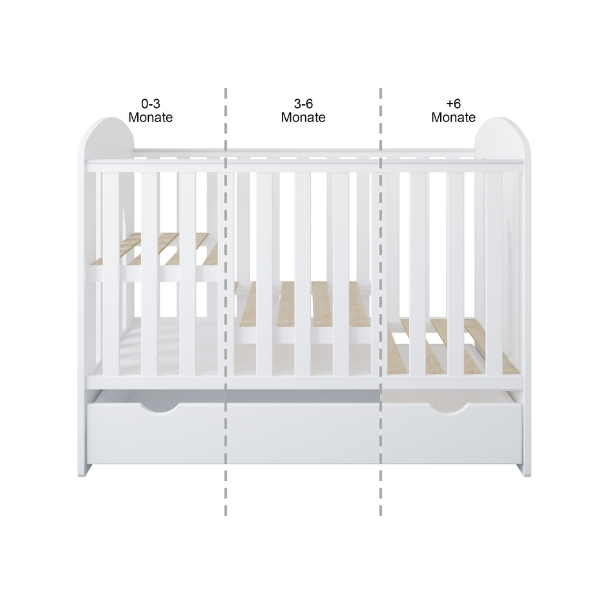 Łóżeczko spełnia najwyższe standardy bezpieczeństwa – odległość między szczebelkami wynosi 6 cm, co eliminuje ryzyko zakleszczenia się dziecka. Zastosowane szerokie, prostokątne szczebelki są bardziej wytrzymałe niż tradycyjne okrągłe, a ich kształt ułatwia dziecku naukę wstawania i wspinania się. Opcjonalnie można dokupić praktyczną szufladę, idealną do przechowywania pościeli lub akcesoriów. To łóżeczko, które łączy funkcjonalność, bezpieczeństwo i ponadczasowy design – stworzone po to, by zapewnić maluszkowi spokojny i zdrowy sen.