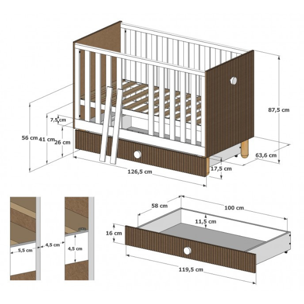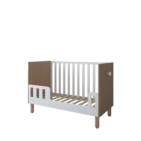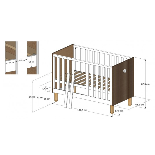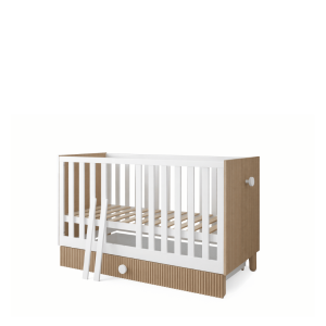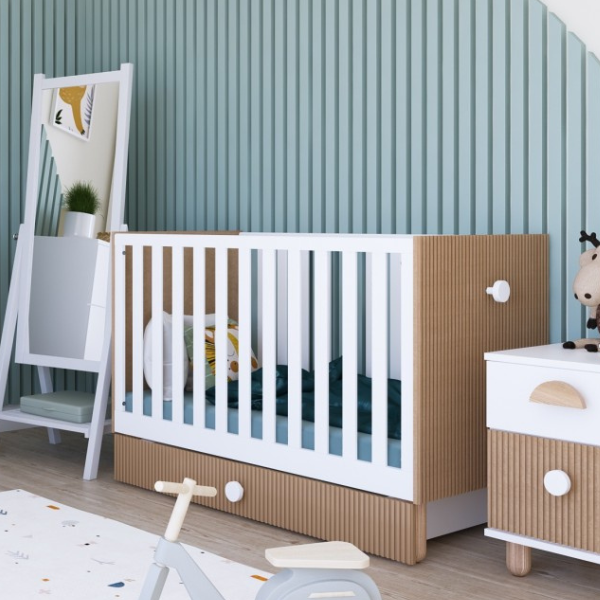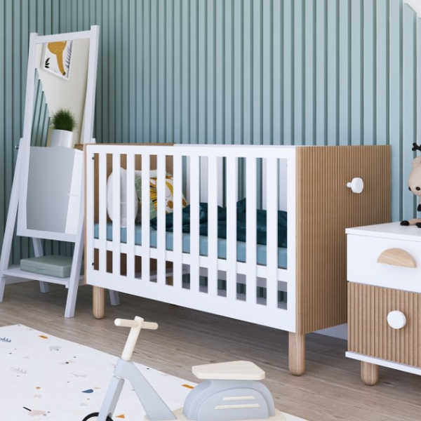 Łóżeczko dziecięce Loft to wyjątkowy mebel, który harmonijnie łączy nowoczesny design, funkcjonalność i bezpieczeństwo, tworząc idealne rozwiązanie zarówno dla niemowląt, jak i starszych dzieci. Utrzymane w subtelnej kolorystyce bieli i naturalnego drewna z bukowymi nogami i uchwytami, łóżeczko wprowadza do wnętrza ciepło i przytulność, idealnie wpisując się w estetykę stylu skandynawskiego i boho. Drewniane, frezowane boki oraz białe szczebelki dodają mu elegancji i lekkości, a jednocześnie podkreślają naturalny charakter mebla.