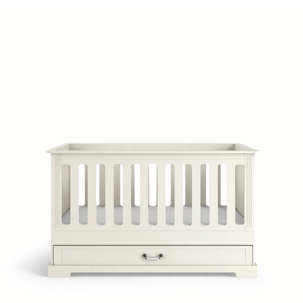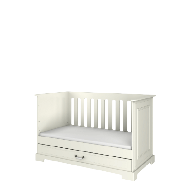 To łóżeczko dziecięce z szufladą i barierką, które doskonale uzupełnia kolekcję Bellamy Ines i pozwala stworzyć spójną, elegancką aranżację wnętrza.