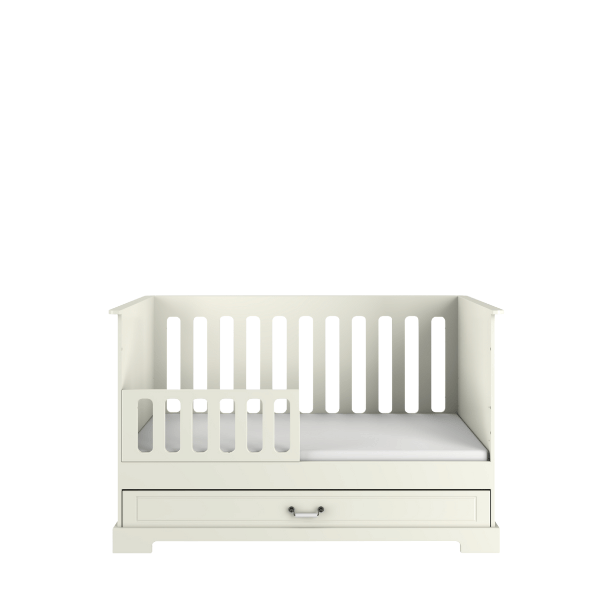 Model łączy estetykę z codzienną wygodą użytkowania. Dzięki możliwości demontażu przedniej ramki łóżeczko można zmienić w wygodny tapczanik, a pojemna szuflada pomaga utrzymać porządek w pokoju dziecka.