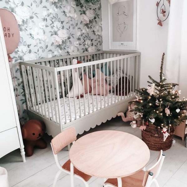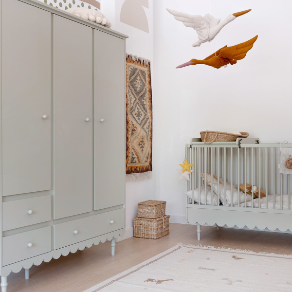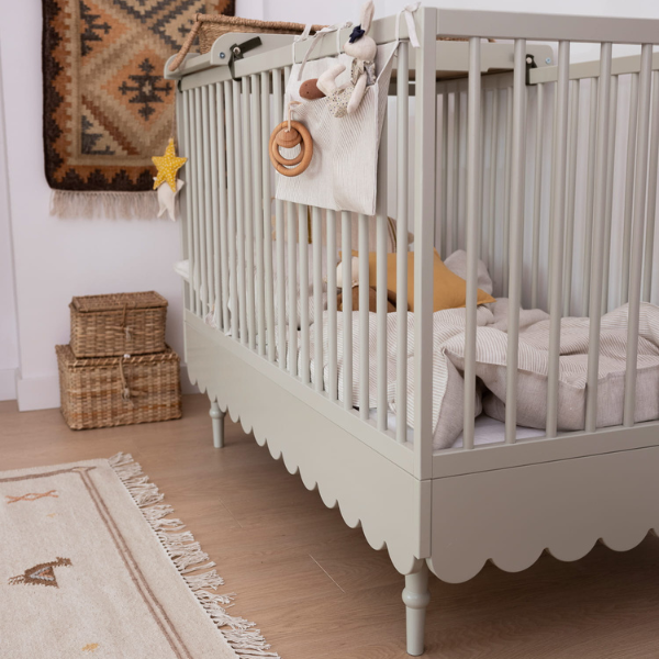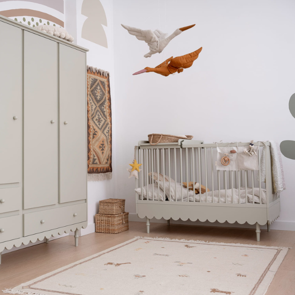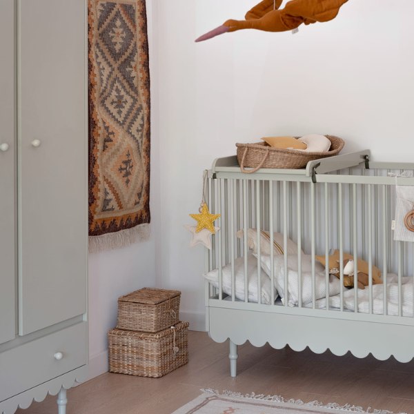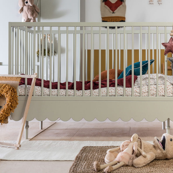 Łóżeczko niemowlęce w stylu vintage w kolorze oliwkowym — elegancja i funkcjonalność do pokoju dziecka