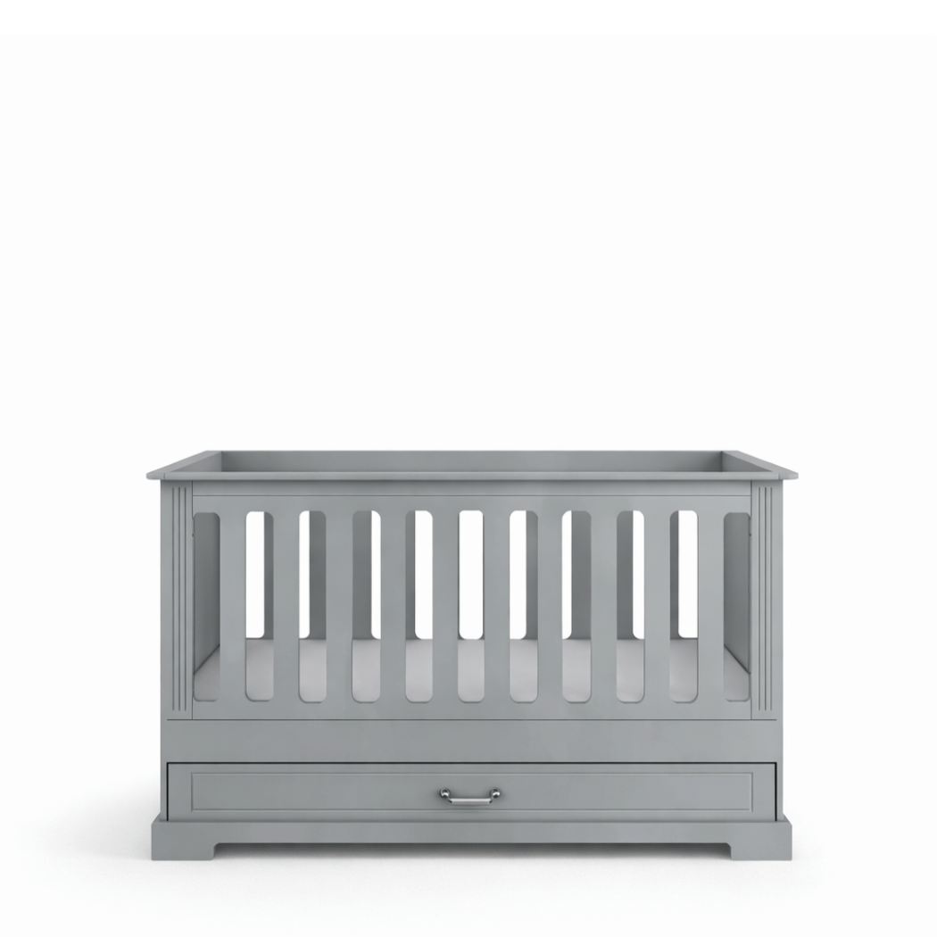 To szare łóżeczko dziecięce z szufladą i barierką, które doskonale uzupełnia kolekcję Bellamy Ines i pozwala stworzyć spójną, elegancką aranżację wnętrza.