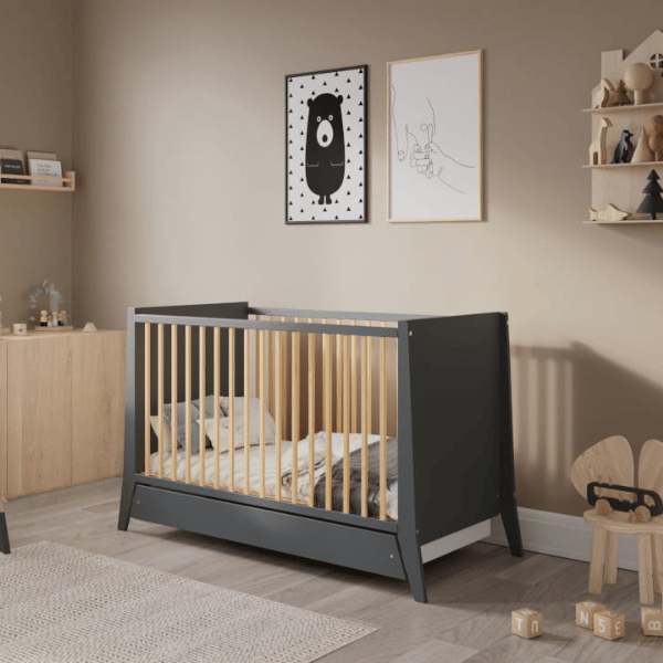 Łóżeczko Cosmo 60x120 cm z szufladą Szare + drewno