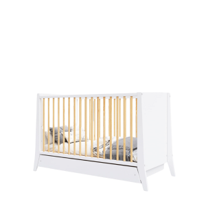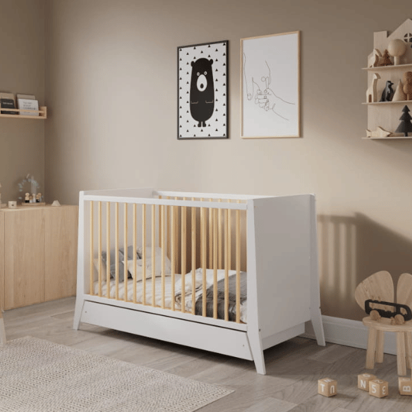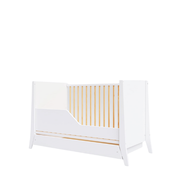 Łóżeczko Cosmo 60x120 cm z szufladą, białe z drewnem
