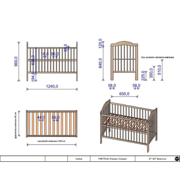 Do łóżeczka pasuje materac o wymiarach 120 × 60 cm, w wariantach możecie dobrać materace najwyższej jakości zapewniający zdrowy sen Waszemu maluszkowi.